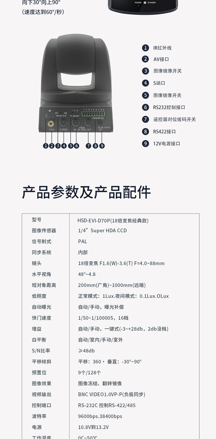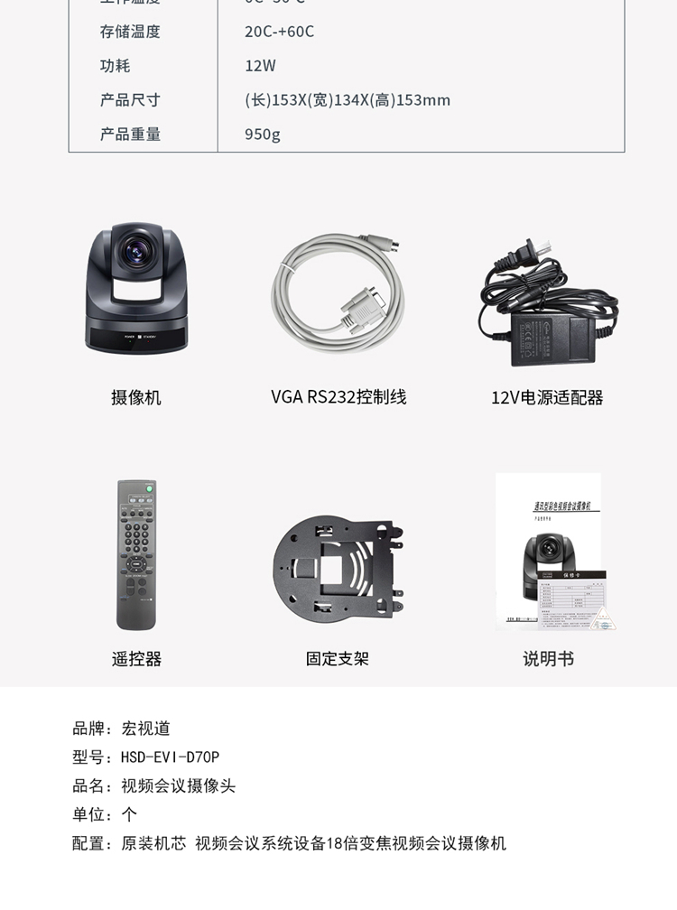 - 商品名称:宏视道 HSD-EVI-D70P 视频会议摄像头原装机芯 视频会议系统设备18倍变焦视频会议摄像机 单位:个