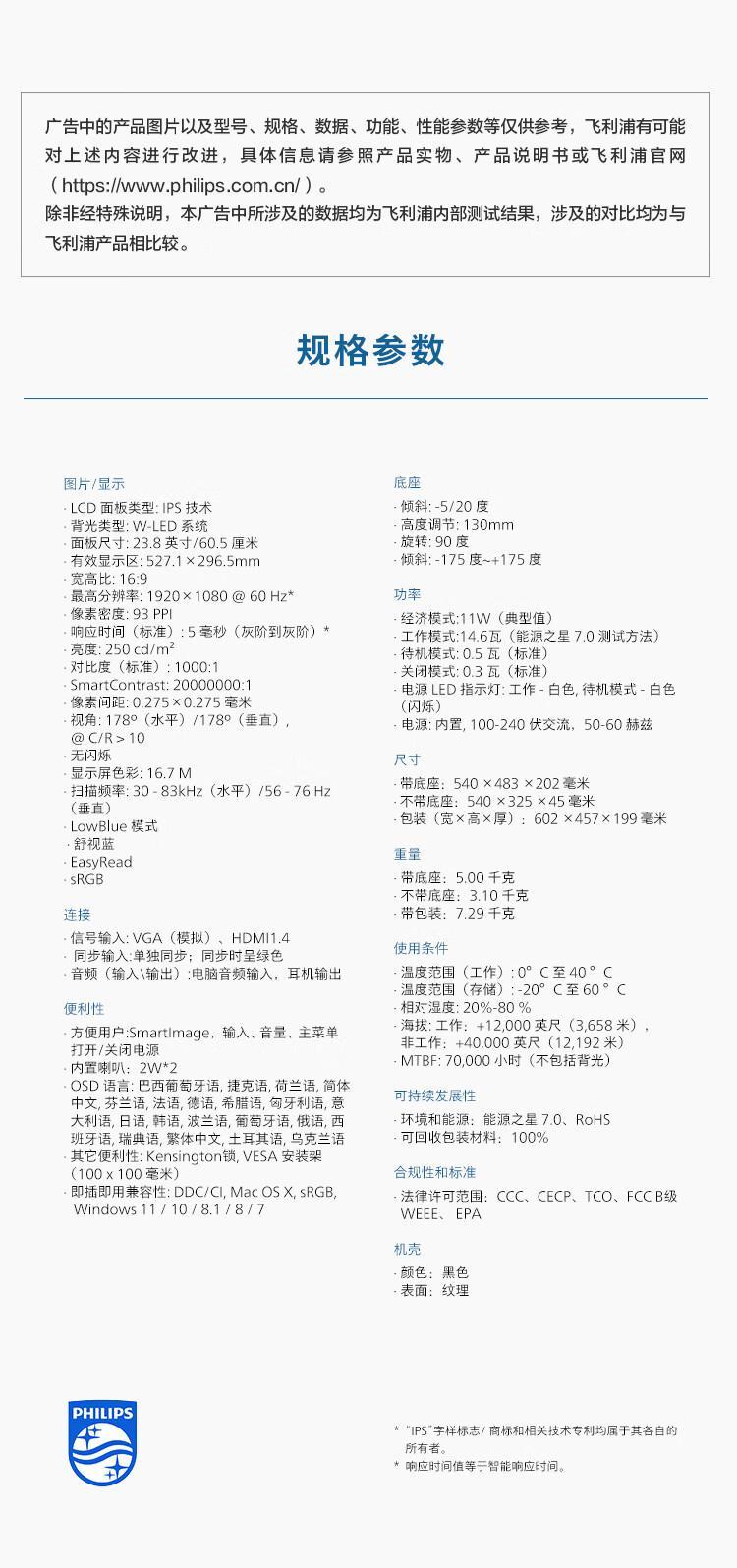 - 商品名称:飞利浦 243S7EHMB/93 23.8英寸 显示器 黑色 (单位:台)