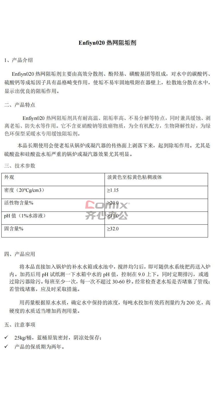 - 商品名称:英菲源 热网阻垢剂 Enfiyn020 淡黄色液体,密度≥1.15,阻垢率>90%,腐蚀率≤0.002‰,25kg/桶 单位:桶