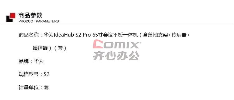 - 商品名称:华为IdeaHub S2 Pro 65寸会议平板一体机(含落地支架+传屏器+遥控器) 计价单位:套