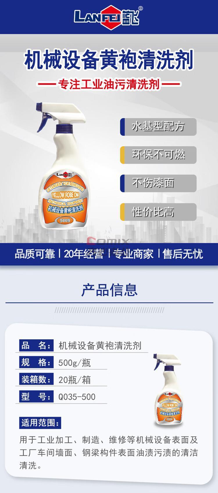 - 商品名称:蓝飞(LANFEI) 通用工业清洗剂 Q035-500 机械设备黄袍清洗剂 500g 单位:瓶