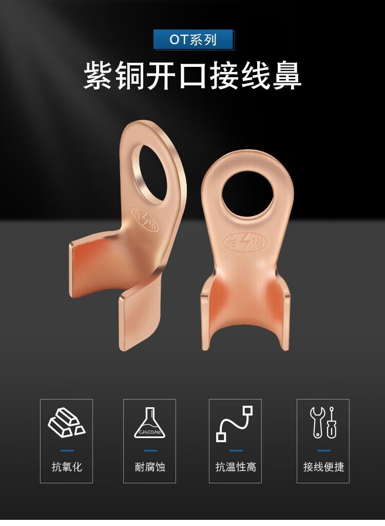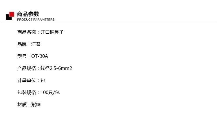 - 商品名称:汇君 OT-30A 开口铜鼻子 线径2.5-6mm2 100只/包 紫铜 单位:包