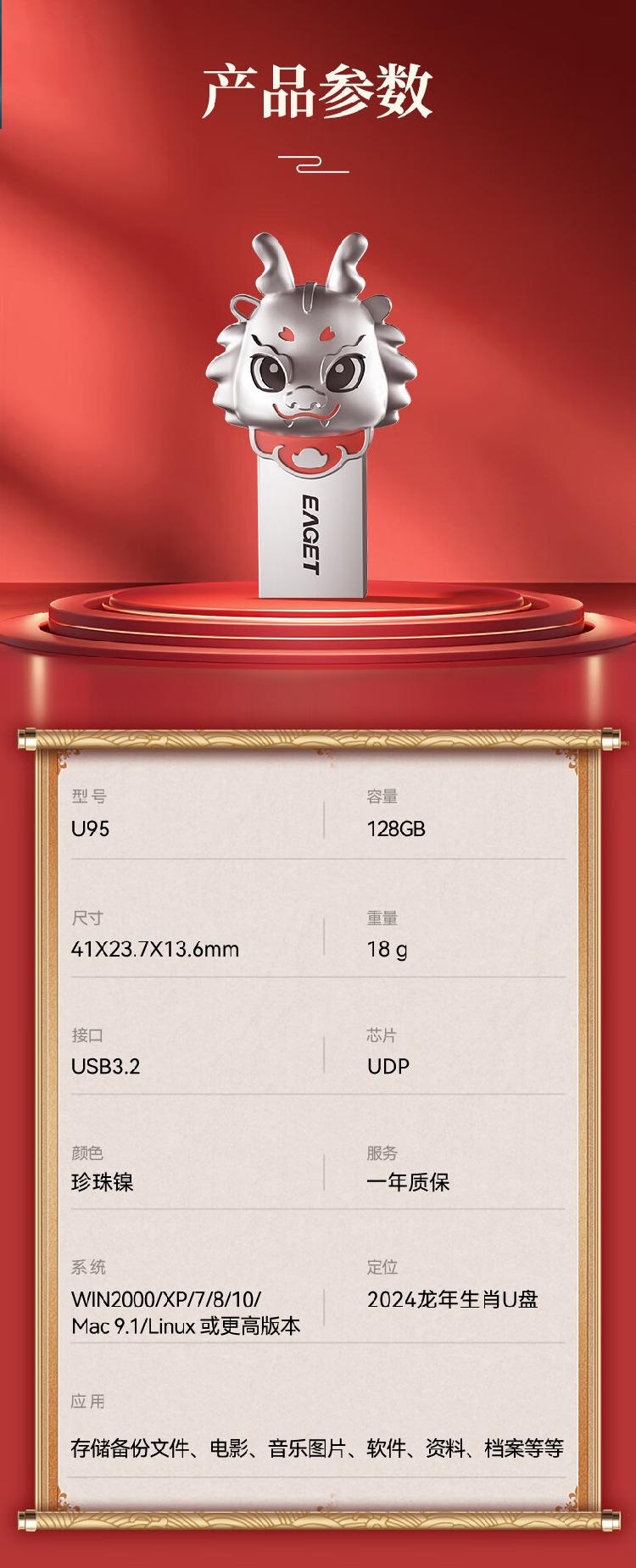 - 商品名称:忆捷(EAGET) U95-128G U盘 128G,USB3.2 单位:个