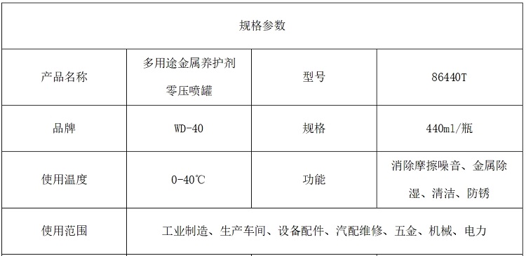 - 商品名称:WD-40 多用途金属养护剂 零压喷罐 86440T 440ml/瓶 GB/T 16483-2008 (单位:瓶)